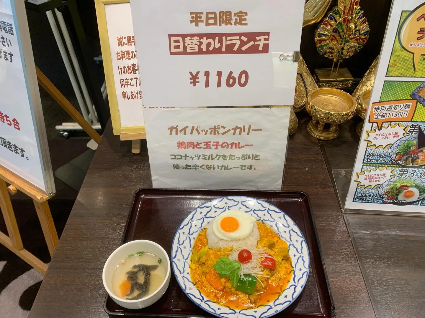 本日の日替わりランチ。 2026/01/08 本日の日替わりランチ。 鶏肉の玉子カレー(税込1160円)。 週替わり麺。 グリーンカレーのまぜそば(税込1130円)。 週替わり盛り合わせランチ。 タイカレーとカオマンガイの盛り合わせ(税込1340円)です。 ご来店をお待ちしております。 #ポンカリー #グリーンカレー #タイカレー #カオマンガイ #コレド日本橋