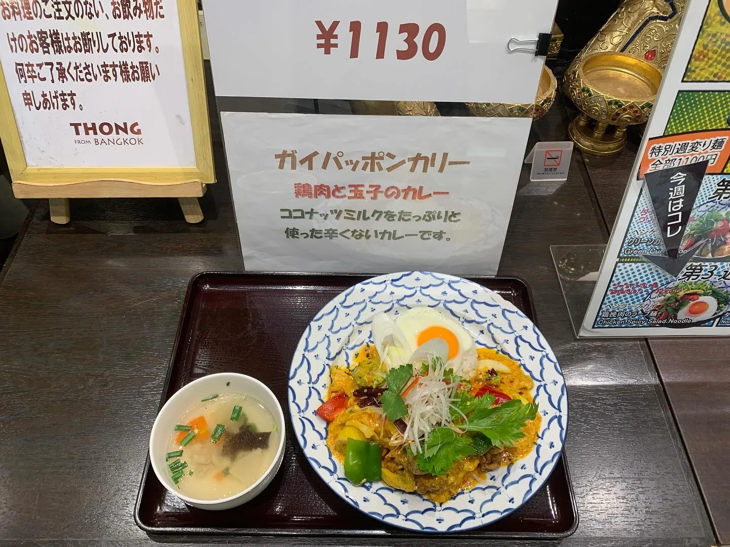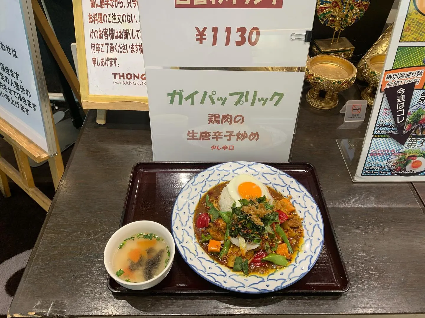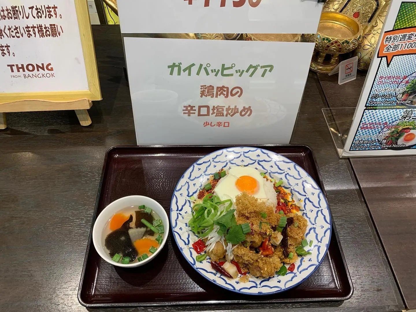 本日の日替わりランチ。 本日の日替わりランチ。鶏肉の黒胡椒炒め(税込1130円)。週替わり麺。チェンマイ地方のカレー汁そば(税込1100円)。週替わり盛り合わせランチ。ガパオライスとパッタイの盛り合わせ(税込1320円)です。ご来…