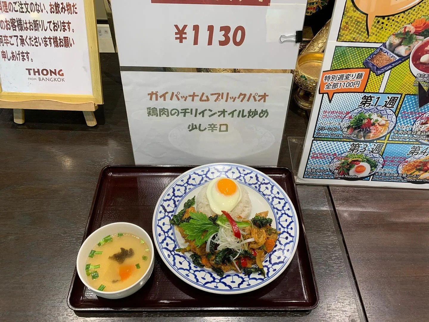 本日の日替わりランチ。鶏肉のスパイシーハーブ炒め(税込1130円)。週替わり麺。チェンマイ地方のカレー汁そば(税込1100円)。週替わり盛り合わせランチ。ガパオライスとパッタイの盛り合わせ(税込1320円)…